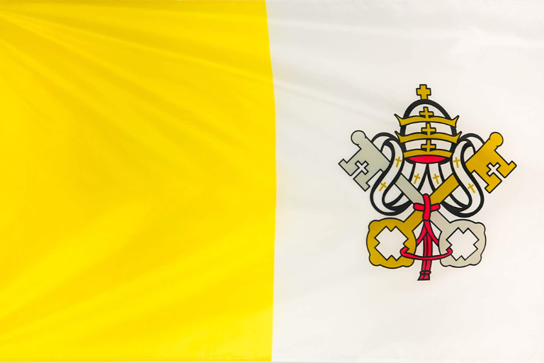 The flag of Vatican City is a square-shaped banner showcasing two vertical bands of gold and white, symbolizing the spiritual and worldly authority of the Pope. The crossed keys and papal tiara add religious significance, making it one of the most unique flags in the world.