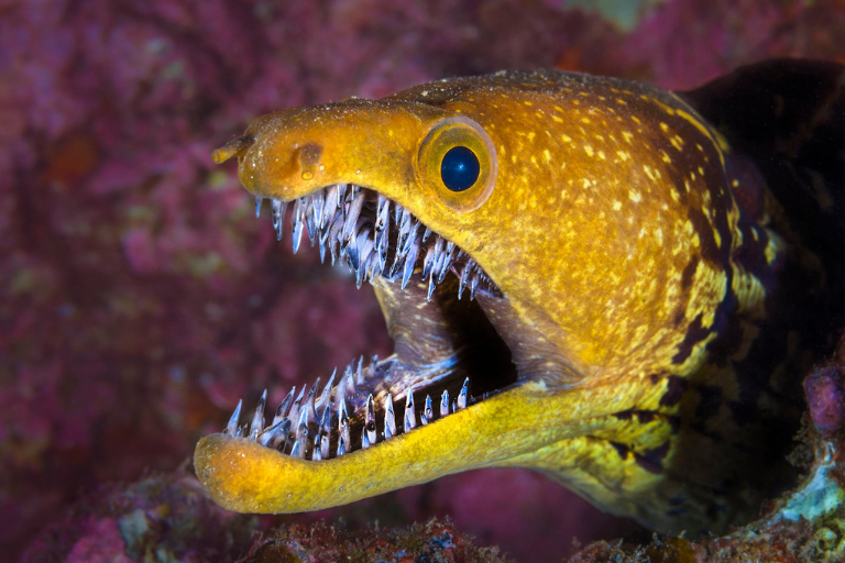 Beneath the ocean’s surface, the moray eel lurks with a set of fearsome teeth arranged in a pharyngeal jaw. These teeth allow them to grab prey and drag it into their throat for consumption.
