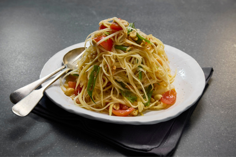 A staple in Thai street food, Som Tum is a refreshing salad made from green papaya, tomatoes, peanuts, and a zesty dressing made from lime juice, fish sauce, and palm sugar. This dish embodies the perfect balance of sweet, sour, salty, and spicy, making it an invigorating start to any meal. Don’t be surprised if you find yourself craving it frequently; its addictive qualities are hard to resist!