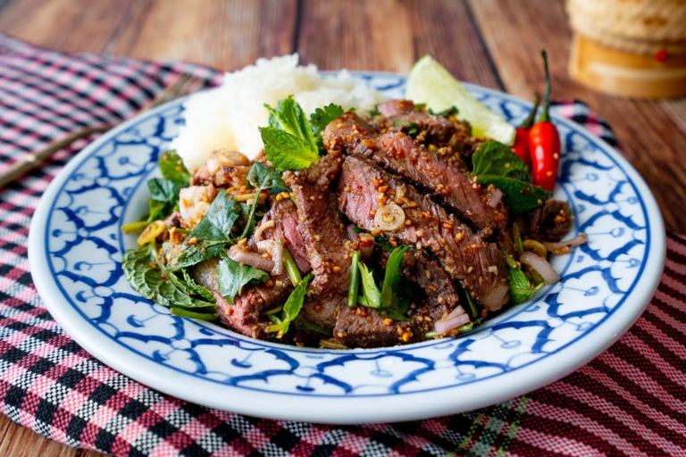 If you enjoy spicy dishes, Larb will surely entice you. This northeastern Thai salad, commonly made with minced meat (chicken, pork, or beef), is flavored with fresh herbs, lime juice, and roasted rice powder, resulting in a flavor explosion that’s both fragrant and invigorating. Served with sticky rice, Larb is a favorite among locals and should not be skipped.