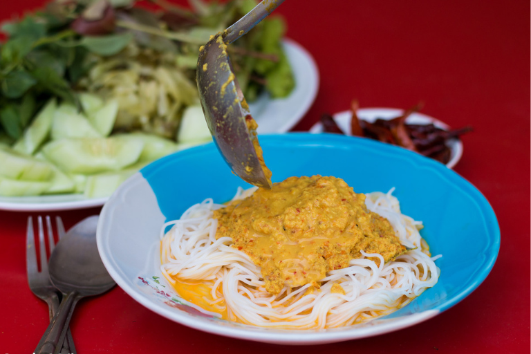 For those looking to explore more regional specialties, Khanom Jeen is an exceptional choice. This dish features soft, thin rice noodles served with a rich and spicy fish curry, along with an array of fresh vegetables like bean sprouts, cucumber, and green mango. The combination of flavors and textures makes this dish truly unforgettable.