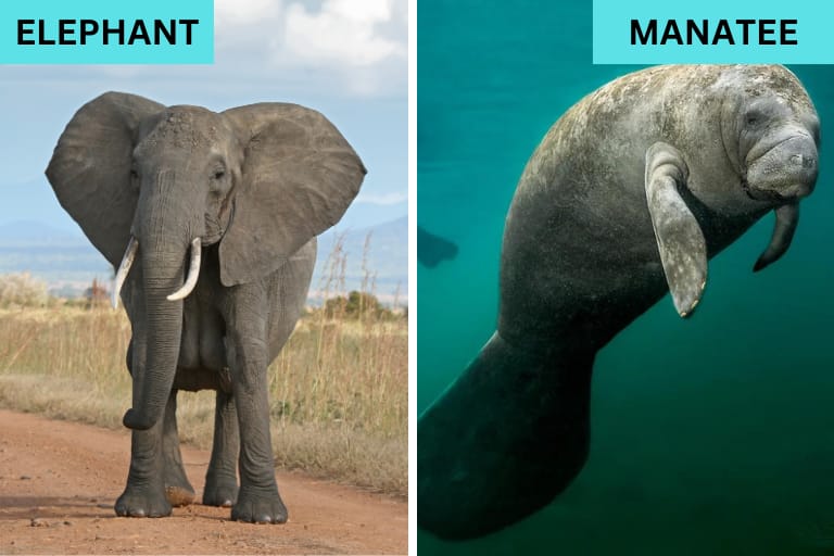 On first glance, these two creatures seem worlds apart. One roams the African savanna, while the other lazes about in tropical waters. However, both elephants and manatees are actually distant relatives, sharing a common ancestor millions of years ago.