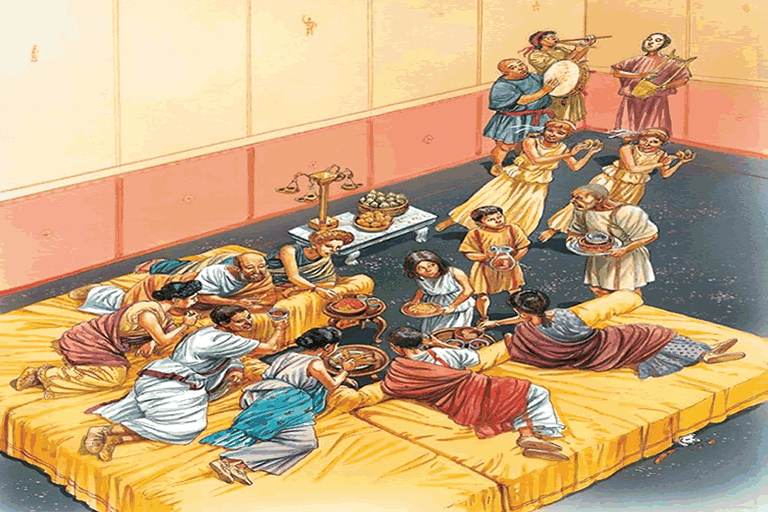 Parties in ancient Rome, looked completely different than parties today. Attending a party during those times, meant being taken to a room line which only had couches and not tables and chairs. They used to support themselves with their left arm and put food in their mouths with their right arm.