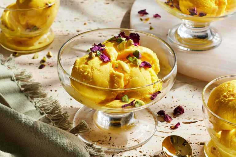Saffron and rose ice cream, or “bastani,” is a traditional Persian delight that embodies the enchanting flavors of its region. This creamy treat is infused with fragrant rosewater, sprinkled with crushed pistachios, and famously includes strands of saffron, which lend a luxurious golden hue. It’s often served with a side of thin wafers for that perfect crunch!