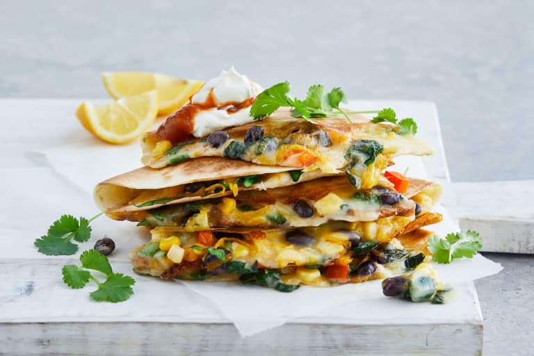 Load tortillas with cheese, black beans, corn, and your favorite veggies. Pan-fry until crispy, and serve with salsa or guacamole.