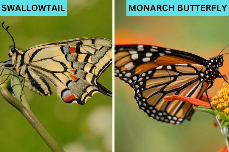 Swallowtail and monarch butterflies have similar wing patterns, but monarchs are smaller and have a more orange hue, while swallowtails are larger with distinct swallow-like tails on their hind wings.