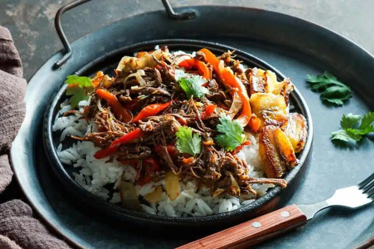 A quintessential dish of Cuban cuisine, ropa vieja consists of shredded beef cooked in a savory tomato-based sauce with bell peppers and onions, typically served with rice and black beans.