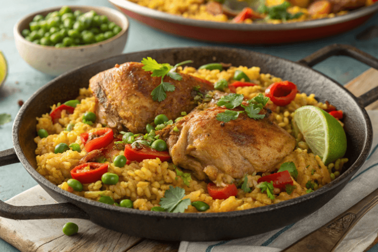 This traditional dish of rice and chicken varies by country but is always packed with flavor. The rice is typically cooked with spices, vegetables, and saffron or achiote for a colorful presentation.