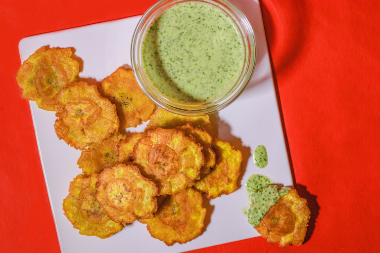 Fried green plantains that are smashed and fried again until crispy, tostones are enjoyed as a snack or side dish across the Caribbean and Central America. Don’t forget the garlic dipping sauce!