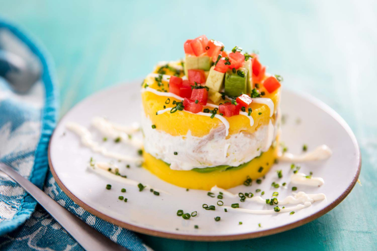 A beautiful layered dish made with mashed yellow potatoes and filled with avocado, chicken, or seafood, causa is served chilled and garnished with olives and hard-boiled eggs.