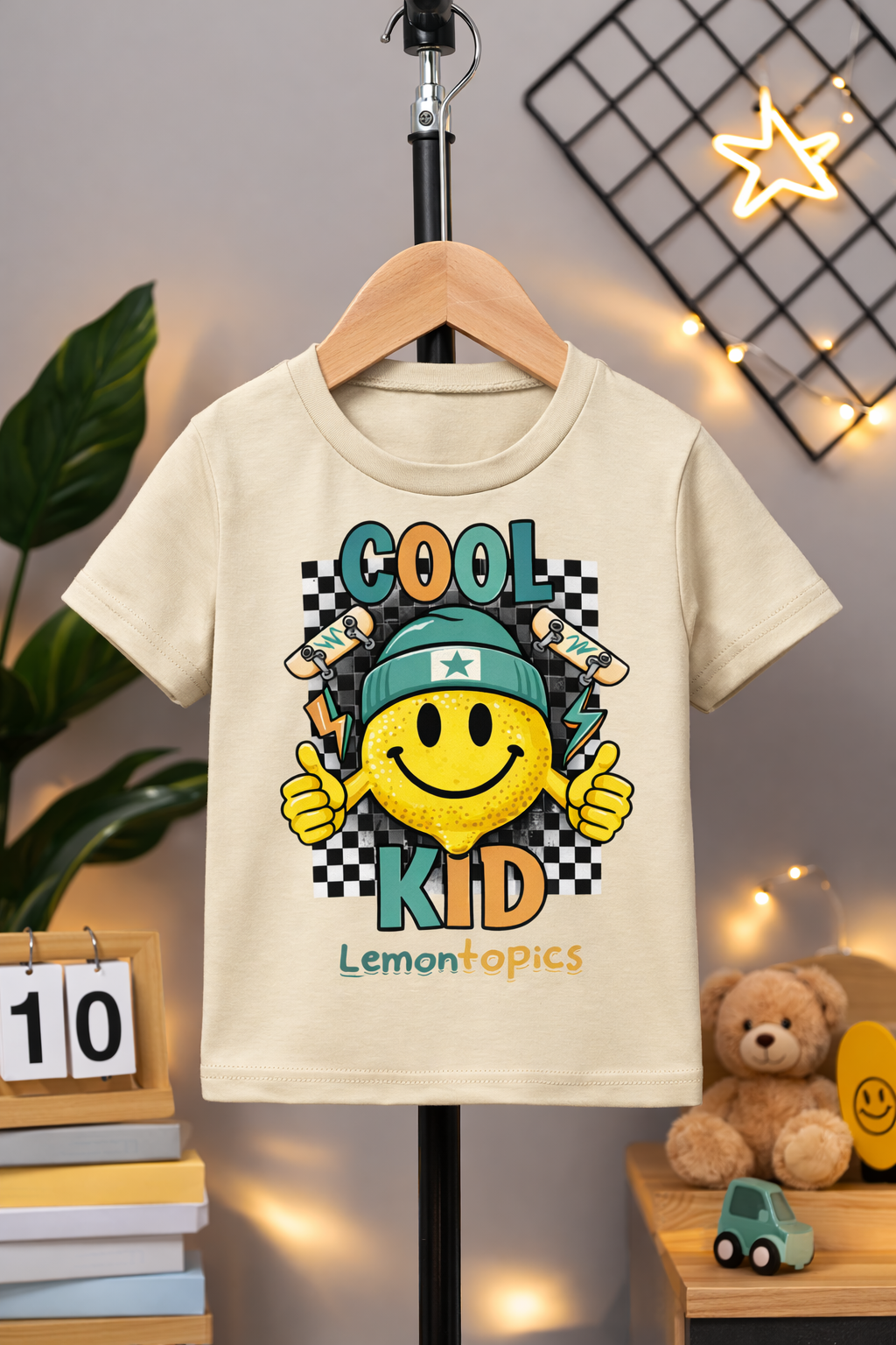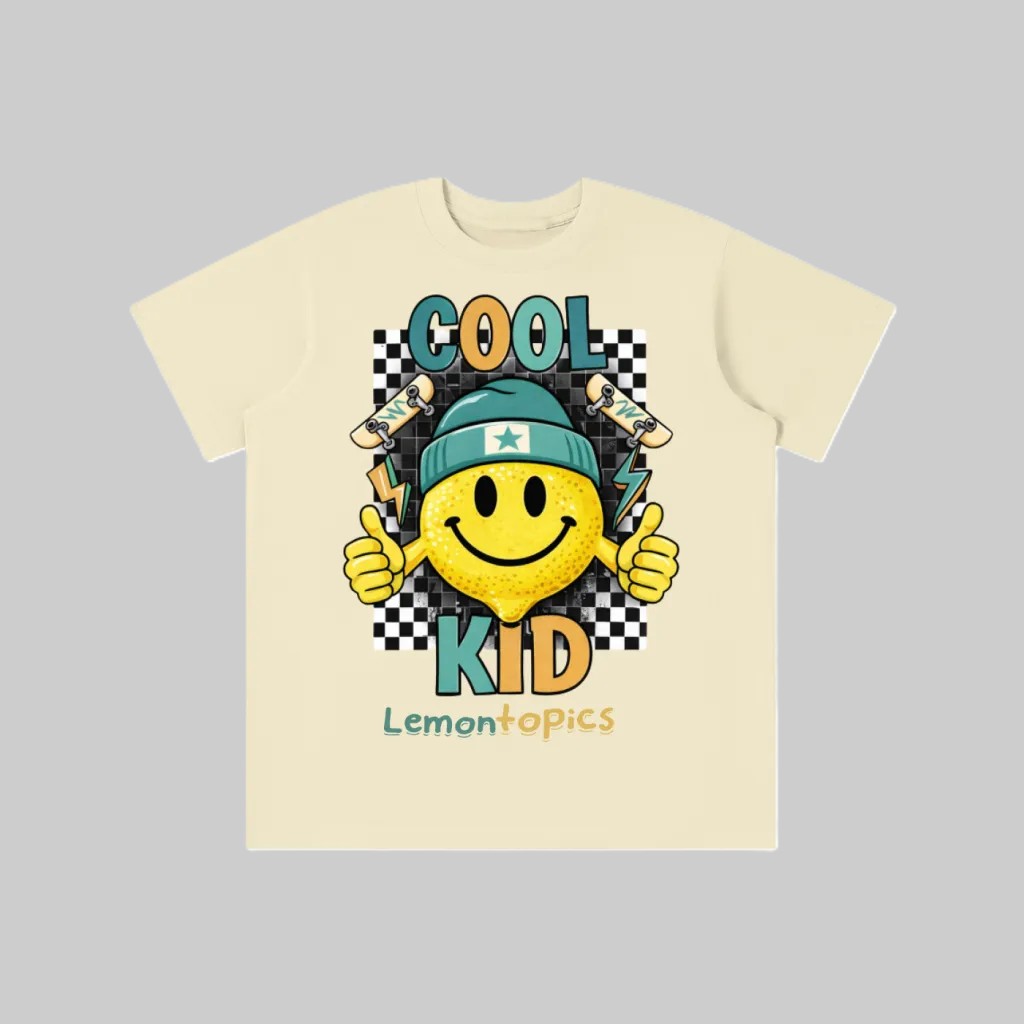 Featuring a bold yellow smiley face rocking a star beanie, throwing double thumbs-up, surrounded by lightning bolts, skateboards, and a classic black-and-white checkerboard background. The vibrant “COOL KID” text pops in playful colors, finished with the signature LemonTopics logo at the bottom.