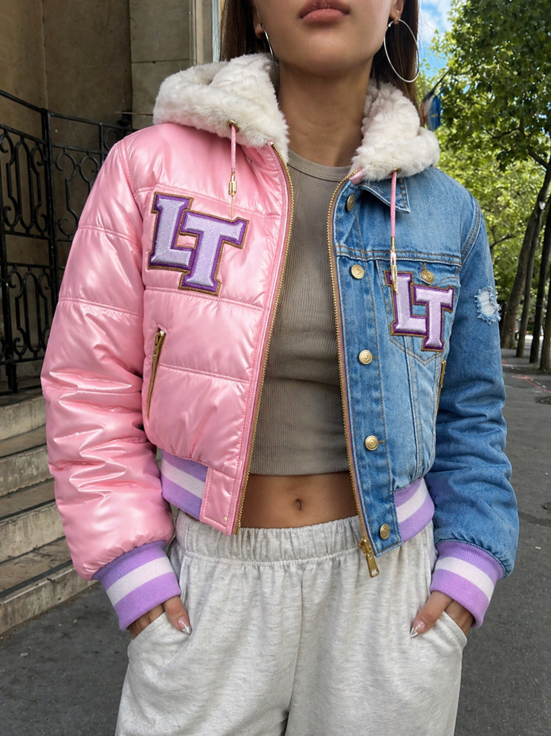This eye-catching design fuses two distinct aesthetics into one seamless statement: a glossy pastel pink quilted puffer on one side and a classic light-wash denim panel on the other. The contrast creates a unique, split-style look that instantly grabs attention while remaining effortlessly wearable.