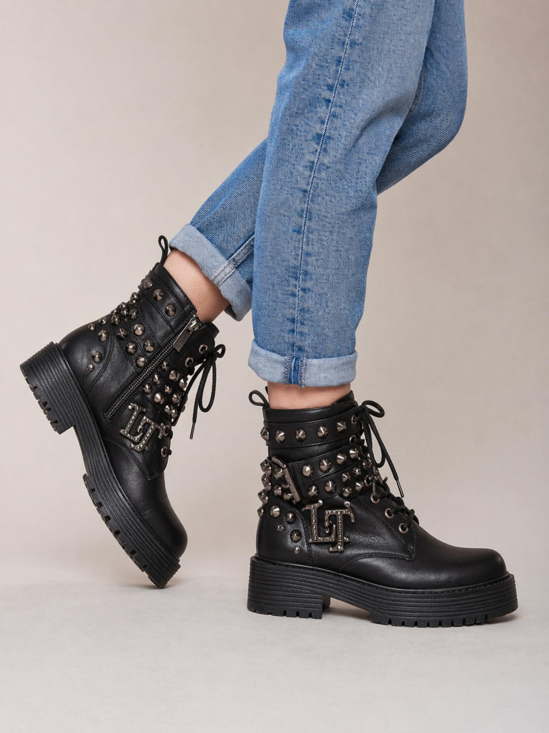 Design & Craftsmanship: Constructed from premium, full-grain matte black leather, the Iron-Zest boot features a structured shaft that maintains its silhouette through daily wear. The design is defined by its aggressive yet balanced hardware: hand-set metallic dome studs that frame the ankle, paired with the signature metallic “LT” emblem—a bold mark of brand identity.