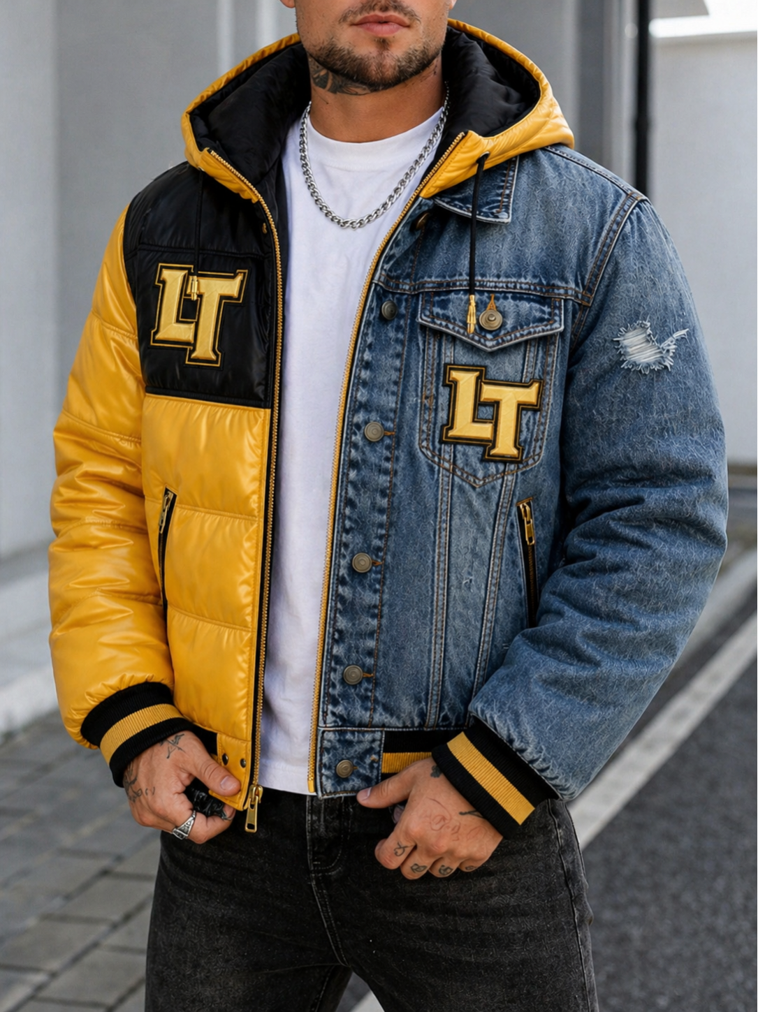 The jacket features a striking two-tone construction: one side showcases a sleek, insulated puffer in vibrant yellow and black for warmth and modern appeal, while the other side incorporates premium denim with a slightly distressed finish for a rugged, street-inspired vibe. The iconic “LT” embroidered patches on both sides add a signature designer feel, giving the jacket a high-end, exclusive look.