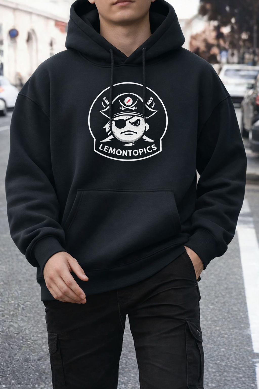 Featuring a fierce (and slightly grumpy) lemon pirate rocking an eyepatch, classic captain’s hat, crossed swords, and a no-nonsense scowl, all framed in a clean circular badge design. The white print pops perfectly against the deep black hoodie, with “LEMONTOPICS” proudly arched below – equal parts cheeky, quirky, and ready to conquer the high seas… or just your couch.