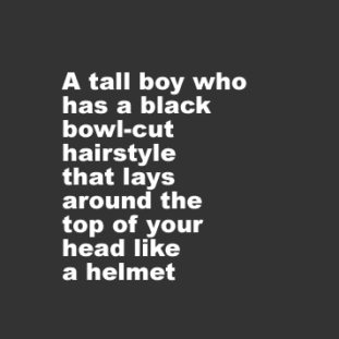 A tall boy who has a black bowl-cut hairstyle that lays around the top of your head like a helmet -