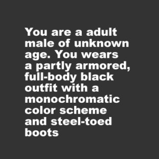 You are a adult male of unknown age. You wears a partly armored, full-body black outfit with a monochromatic color scheme and steel-toed boots