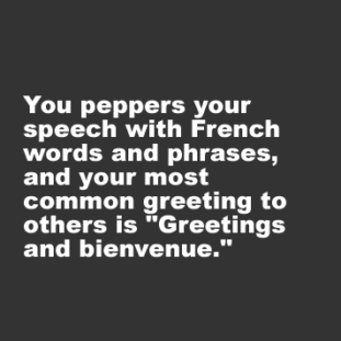 You peppers your speech with French words and phrases, and your most common greeting to others is “Greetings and bienvenue.” -