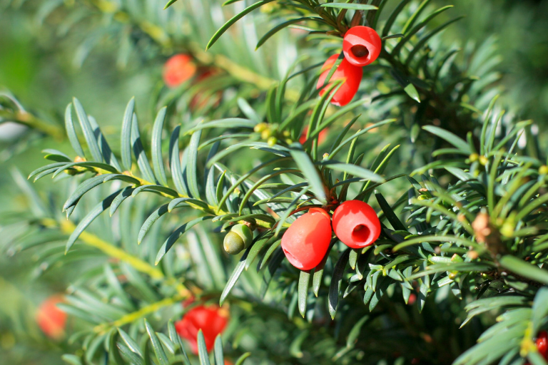 The English yew is a dark, evergreen tree long associated with death and mourning—it’s often found in graveyards. All parts of the plant except the red arils (fleshy berry-like fruit surrounding the seed) are highly toxic, especially the seeds and needles. Taxine alkaloids can cause sudden cardiac arrest. Death can occur within hours of ingestion. Strikingly, livestock are also at risk, and entire herds have perished after eating trimmed yew branches.